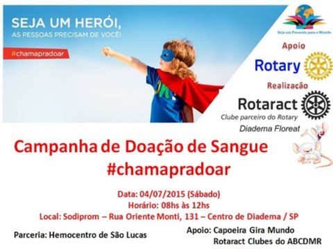 O Rotaract Club Diadema Floreat convoca todos os companheiros Rotarianos, Rotaractianos, Interactianos e toda Família Rotária a estar participando da nossa Campanha de Doação de Sangue. A coleta será feita pelo Hemocentro São Lucas na Sodiprom - Rua Oriente Monti, 131 - Centro - Diadema/SP, no horário de 08hs as 12hs no dia 04/07 (sábado)...Venha e traga um amigo para doar também !!! Contamos com você !!!