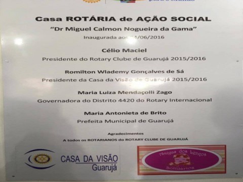 Prontamente já abriga a Casa da Visão de Guarujá e o Instituto Amigas dos Lenços Solidários. A inauguração contou com a presença de várias autoridades civis, rotarianos e convidados, em especial a presença da Sra. Prefeita Municipal de Guarujá, Maria Antonieta de Brito e da Governadora do Distrito 4420 Maria Luiza Mendaçolli Zago.